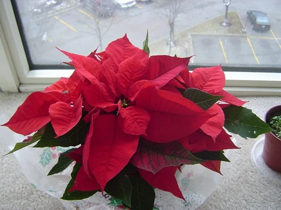النبتة الاحتفالية الأشهر، تتميز بأوراقها العلوية الحمراء القانية التي تشبه الزهور. تضفي بهجة ولمسة دافئة على الديكور الداخلي، خاصة في فصل الشتاء.